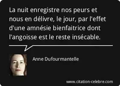 La nuit enregistre nos peurs et nous en délivre, le jour, par l'effet d'une amnésie bienfaitrice dont l'angoisse est le reste insécable.
