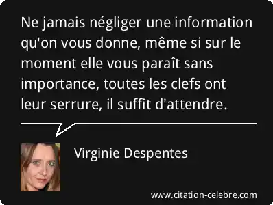Ne jamais négliger une information qu'on vous donne, même si sur le moment elle vous paraît sans importance, toutes les clefs ont leur serrure, il suffit d'attendre.