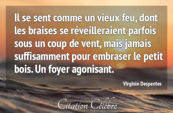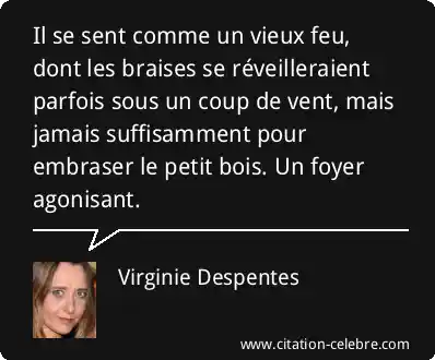 Il se sent comme un vieux feu, dont les braises se réveilleraient parfois sous un coup de vent, mais jamais suffisamment pour embraser le petit bois. Un foyer agonisant.