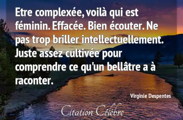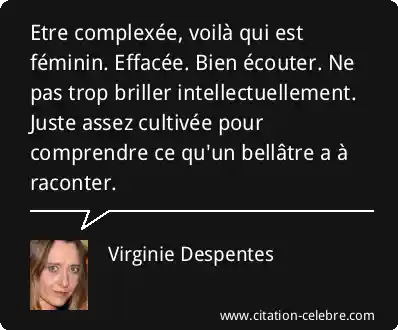 Etre complexée, voilà qui est féminin. Effacée. Bien écouter. Ne pas trop briller intellectuellement. Juste assez cultivée pour comprendre ce qu'un bellâtre a à raconter.
