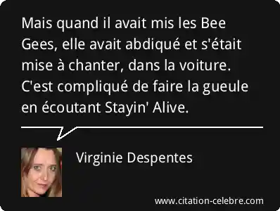 Mais quand il avait mis les Bee Gees, elle avait abdiqué et s'était mise à chanter, dans la voiture. C'est compliqué de faire la gueule en écoutant Stayin' Alive.