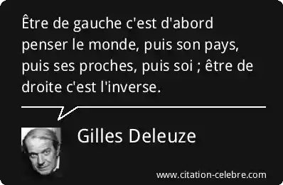 Cette célèbre formule de Gilles Deleuze propose une définition des positions politiques de gauche et de droite basées sur l'ordre des priorités et la portée du regard. Pour Deleuze, être de gauche signifie adopter une perspective universelle et globale avant de se concentrer sur l'individuel. C'est un mouvement de pensée qui va du Monde vers le Soi. Inversement, être de droite est caractérisé par un mouvement centripète, qui part de l'individu et de ses préoccupations immédiates pour élargir, éventuellement, sa considération au reste du monde.
