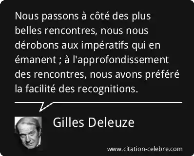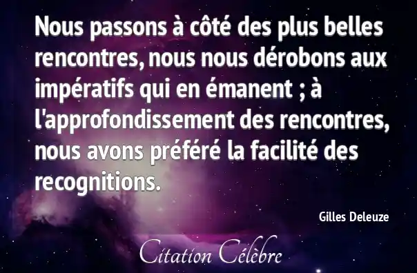 Nous passons à côté des plus belles rencontres, nous nous dérobons aux impératifs qui en émanent ; à l'approfondissement des rencontres, nous avons préféré la facilité des recognitions.