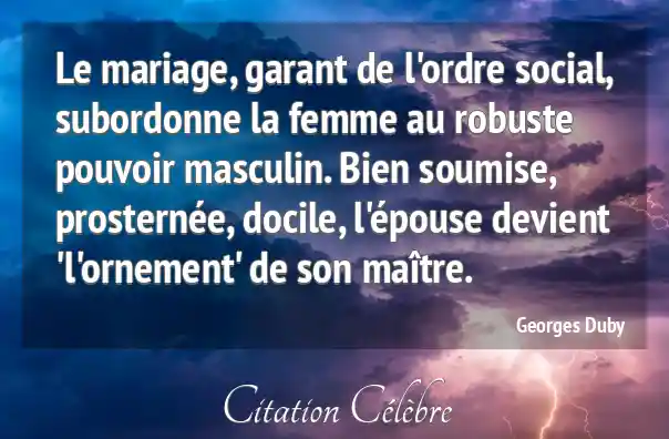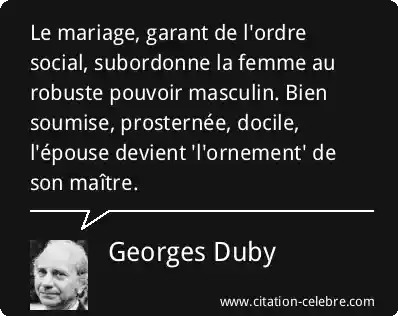 Le mariage, garant de l'ordre social, subordonne la femme au robuste pouvoir masculin. Bien soumise, prosternée, docile, l'épouse devient 'l'ornement' de son maître.