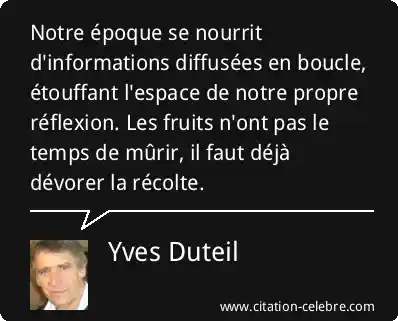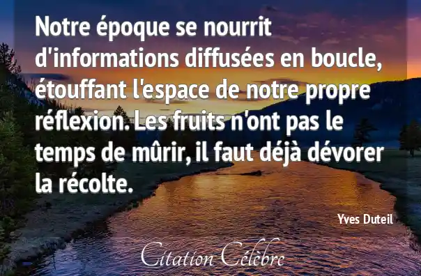 Notre époque se nourrit d'informations diffusées en boucle, étouffant l'espace de notre propre réflexion. Les fruits n'ont pas le temps de mûrir, il faut déjà dévorer la récolte.