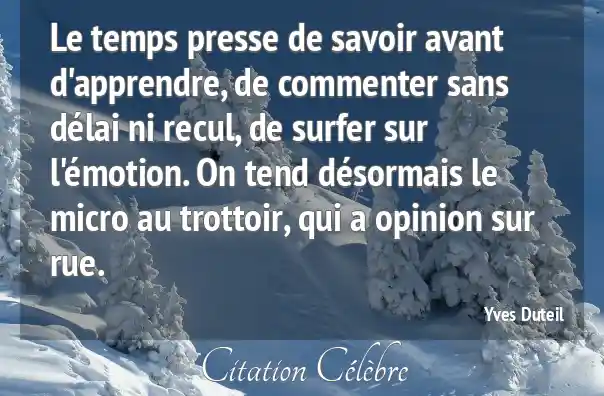 Le temps presse de savoir avant d'apprendre, de commenter sans délai ni recul, de surfer sur l'émotion. On tend désormais le micro au trottoir, qui a opinion sur rue.