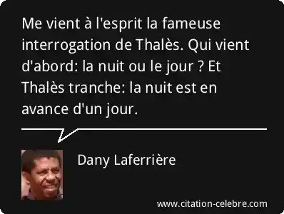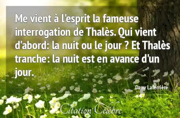 Me vient à l'esprit la fameuse interrogation de Thalès. Qui vient d'abord: la nuit ou le jour ? Et Thalès tranche: la nuit est en avance d'un jour.