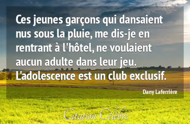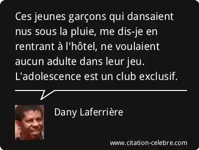 Ces jeunes garçons qui dansaient nus sous la pluie, me dis-je en rentrant à l'hôtel, ne voulaient aucun adulte dans leur jeu. L'adolescence est un club exclusif.