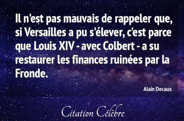 Il n'est pas mauvais de rappeler que, si Versailles a pu s'élever, c'est parce que Louis XIV - avec Colbert - a su restaurer les finances ruinées par la Fronde.