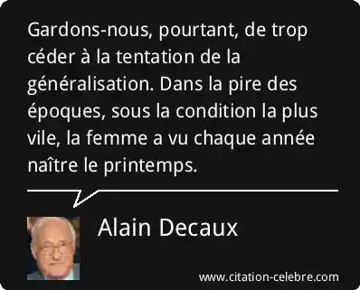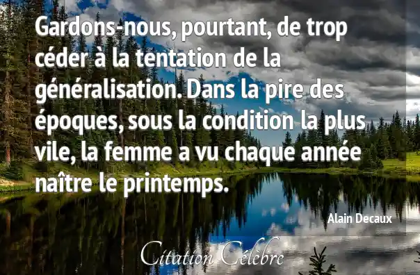 Gardons-nous, pourtant, de trop céder à la tentation de la généralisation. Dans la pire des époques, sous la condition la plus vile, la femme a vu chaque année naître le printemps.