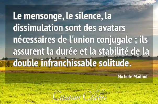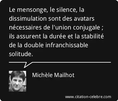 Le mensonge, le silence, la dissimulation sont des avatars nécessaires de l'union conjugale ; ils assurent la durée et la stabilité de la double infranchissable solitude.