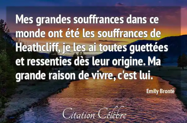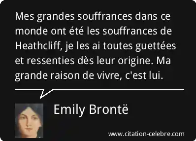 Mes grandes souffrances dans ce monde ont été les souffrances de Heathcliff, je les ai toutes guettées et ressenties dès leur origine. Ma grande raison de vivre, c'est lui.