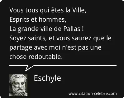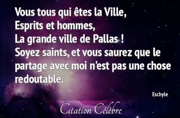 Vous tous qui êtes la Ville,Esprits et hommes,La grande ville de Pallas !Soyez saints, et vous saurez que le partage avec moi n'est pas une chose redoutable.