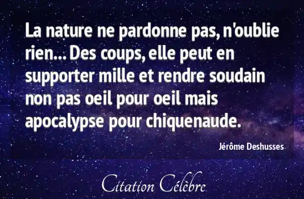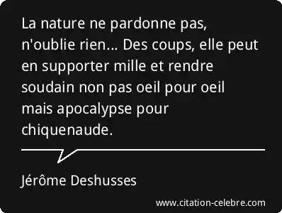 La nature ne pardonne pas, n'oublie rien... Des coups, elle peut en supporter mille et rendre soudain non pas oeil pour oeil mais apocalypse pour chiquenaude.