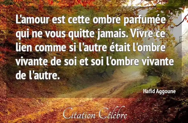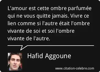 L'amour est cette ombre parfumée qui ne vous quitte jamais. Vivre ce lien comme si l'autre était l'ombre vivante de soi et soi l'ombre vivante de l'autre.