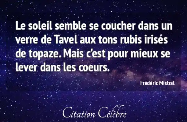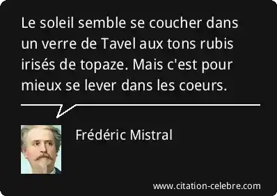 Le soleil semble se coucher dans un verre de Tavel aux tons rubis irisés de topaze. Mais c'est pour mieux se lever dans les coeurs.