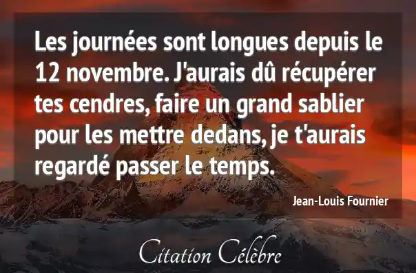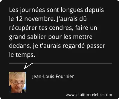 Les journées sont longues depuis le 12 novembre. J'aurais dû récupérer tes cendres, faire un grand sablier pour les mettre dedans, je t'aurais regardé passer le temps.