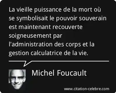 La vieille puissance de la mort où se symbolisait le pouvoir souverain est maintenant recouverte soigneusement par l'administration des corps et la gestion calculatrice de la vie.