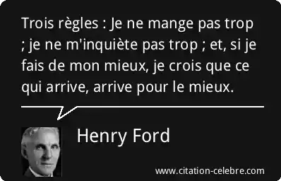 Trois règles : Je ne mange pas trop ; je ne m'inquiète pas trop ; et, si je fais de mon mieux, je crois que ce qui arrive, arrive pour le mieux.