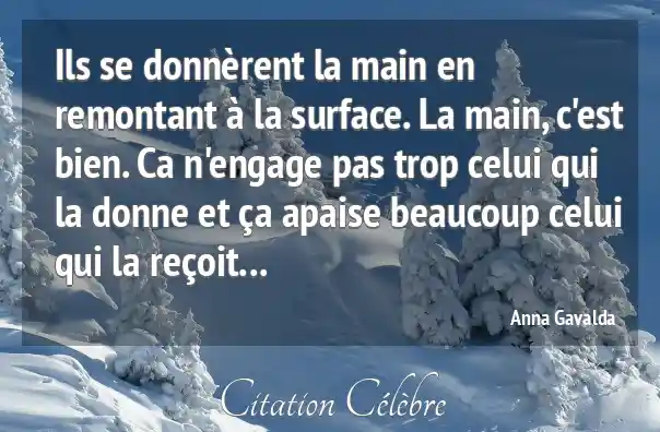 Ils se donnèrent la main en remontant à la surface. La main, c'est bien. Ca n'engage pas trop celui qui la donne et ça apaise beaucoup celui qui la reçoit...