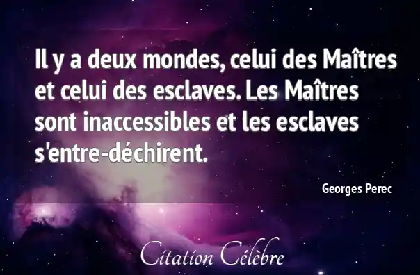 Il y a deux mondes, celui des Maîtres et celui des esclaves. Les Maîtres sont inaccessibles et les esclaves s'entre-déchirent.