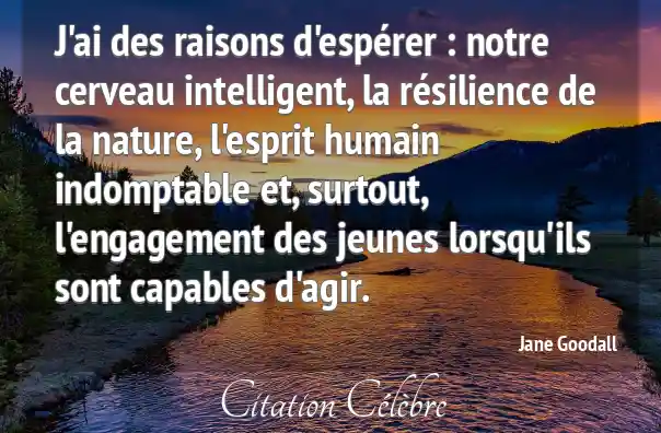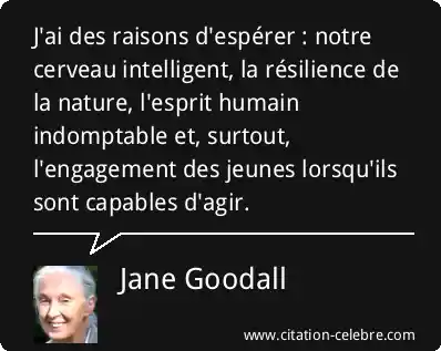 J'ai des raisons d'espérer : notre cerveau intelligent, la résilience de la nature, l'esprit humain indomptable et, surtout, l'engagement des jeunes lorsqu'ils sont capables d'agir.