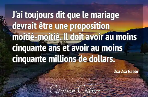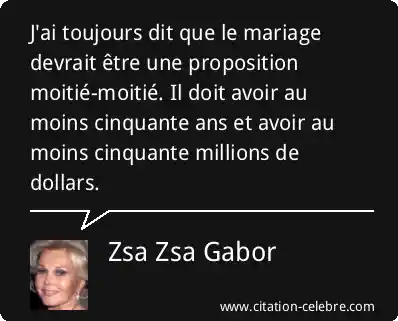 J'ai toujours dit que le mariage devrait être une proposition moitié-moitié. Il doit avoir au moins cinquante ans et avoir au moins cinquante millions de dollars.