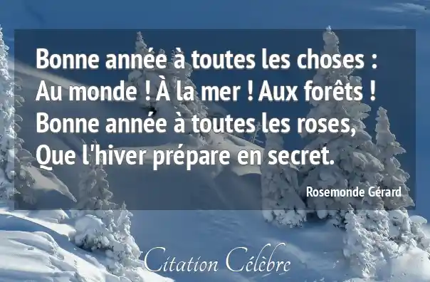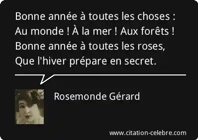 Bonne année à toutes les choses :Au monde ! À la mer ! Aux forêts !Bonne année à toutes les roses,Que l'hiver prépare en secret.