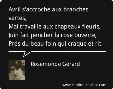 Avril s'accroche aux branches vertes,Mai travaille aux chapeaux fleuris,Juin fait pencher la rose ouverte,Prés du beau foin qui craque et rit.