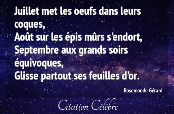 Juillet met les oeufs dans leurs coques,Août sur les épis mûrs s'endort,Septembre aux grands soirs équivoques,Glisse partout ses feuilles d'or.