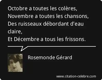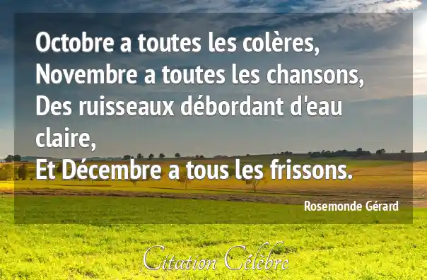 Octobre a toutes les colères,Novembre a toutes les chansons,Des ruisseaux débordant d'eau claire,Et Décembre a tous les frissons.