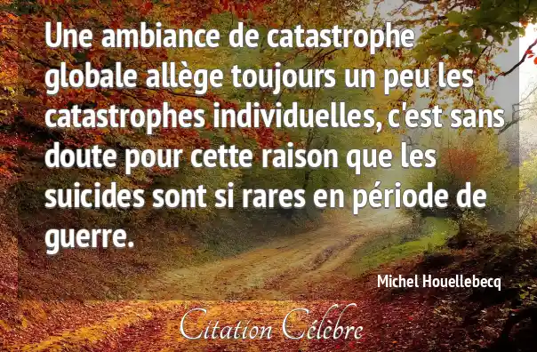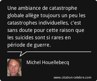 Une ambiance de catastrophe globale allège toujours un peu les catastrophes individuelles, c'est sans doute pour cette raison que les suicides sont si rares en période de guerre.