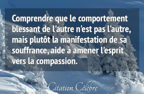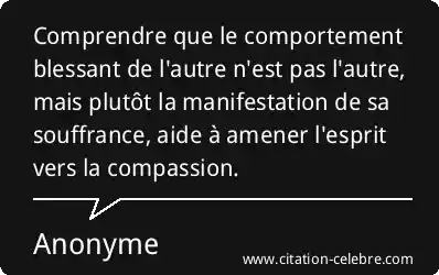 Comprendre que le comportement blessant de l'autre n'est pas l'autre, mais plutôt la manifestation de sa souffrance, aide à amener l'esprit vers la compassion.