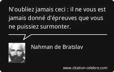 N'oubliez jamais ceci : il ne vous est jamais donné d'épreuves que vous ne puissiez surmonter.