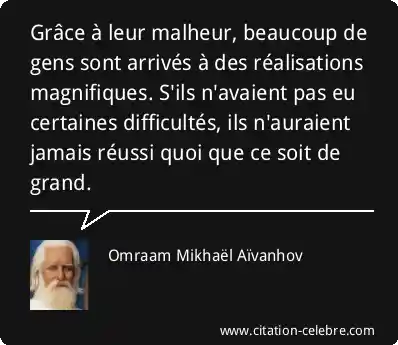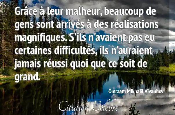 Grâce à leur malheur, beaucoup de gens sont arrivés à des réalisations magnifiques. S'ils n'avaient pas eu certaines difficultés, ils n'auraient jamais réussi quoi que ce soit de grand.