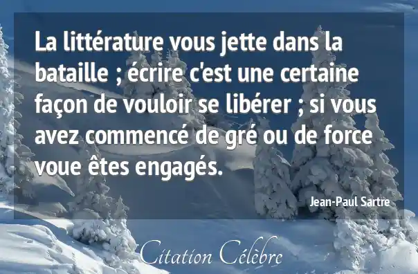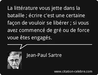 Cette citation de Jean-Paul Sartre, figure majeure de l'existentialisme, affirme que la littérature et l'acte d'écrire ne sont pas des activités passives ou purement esthétiques. Écrire est un acte profond et engageant. C'est une manière d'intervenir dans le monde, d'entrer en «bataille» avec les idées, les injustices ou les situations. L'écriture est un puissant outil pour exprimer un désir de «se libérer», que ce soit d'une oppression personnelle, sociale ou métaphysique. Dès l'instant où l'on commence à écrire, que ce soit par choix («de gré») ou par nécessité intérieure ou extérieure («de force»), on ne peut plus reculer : l'écrivain est «engagé» par et dans son œuvre.