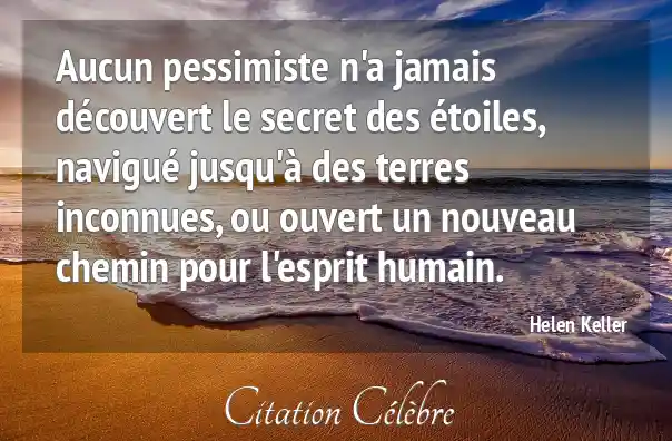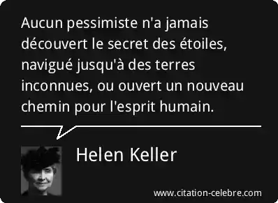Aucun pessimiste n'a jamais découvert le secret des étoiles, navigué jusqu'à des terres inconnues, ou ouvert un nouveau chemin pour l'esprit humain.