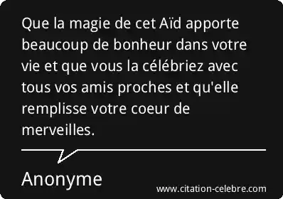 Que la magie de cet Aïd apporte beaucoup de bonheur dans votre vie et que vous la célébriez avec tous vos amis proches et qu'elle remplisse votre coeur de merveilles.