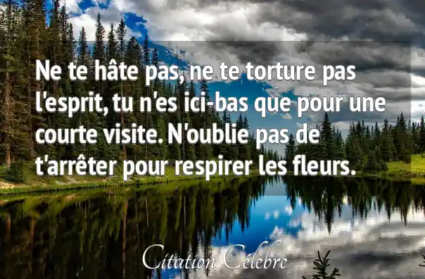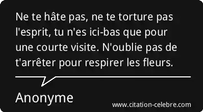 Ne te hâte pas, ne te torture pas l'esprit, tu n'es ici-bas que pour une courte visite. N'oublie pas de t'arrêter pour respirer les fleurs.