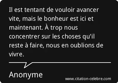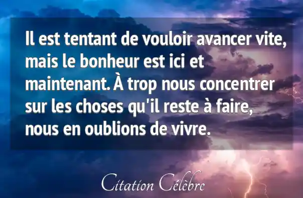 Il est tentant de vouloir avancer vite, mais le bonheur est ici et maintenant. À trop nous concentrer sur les choses qu'il reste à faire, nous en oublions de vivre.