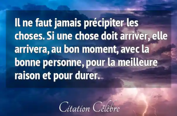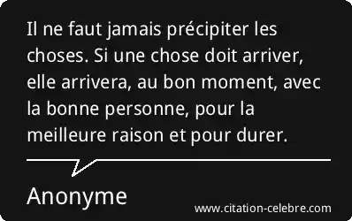 Il ne faut jamais précipiter les choses. Si une chose doit arriver, elle arrivera, au bon moment, avec la bonne personne, pour la meilleure raison et pour durer.