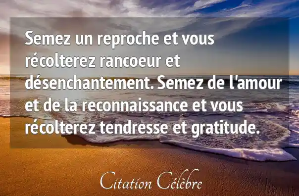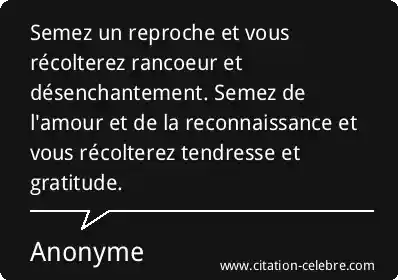 Semez un reproche et vous récolterez rancoeur et désenchantement. Semez de l'amour et de la reconnaissance et vous récolterez tendresse et gratitude.