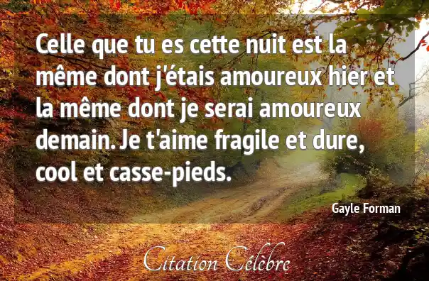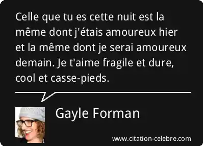 Celle que tu es cette nuit est la même dont j'étais amoureux hier et la même dont je serai amoureux demain. Je t'aime fragile et dure, cool et casse-pieds.