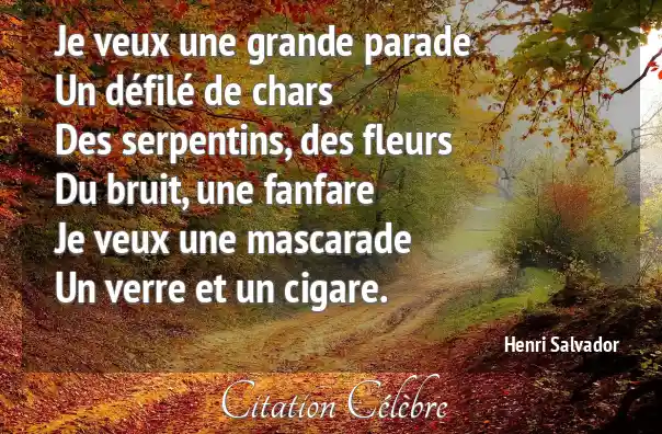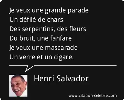 Je veux une grande paradeUn défilé de charsDes serpentins, des fleursDu bruit, une fanfareJe veux une mascaradeUn verre et un cigare.
