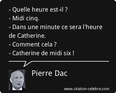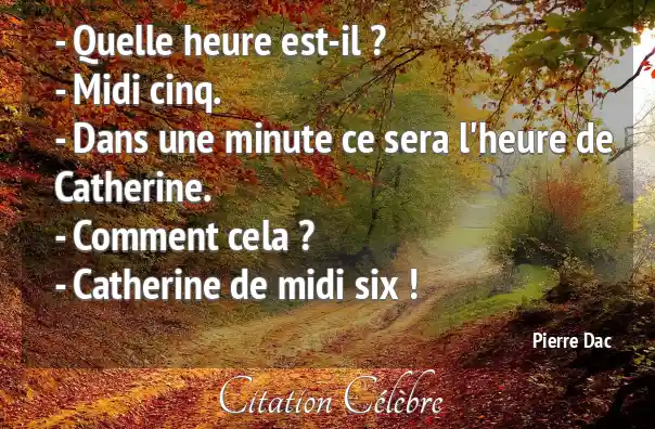 - Quelle heure est-il ?- Midi cinq. - Dans une minute ce sera l'heure de Catherine. - Comment cela ? - Catherine de midi six !
