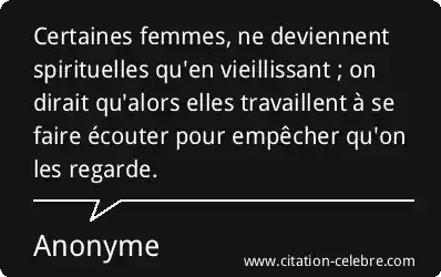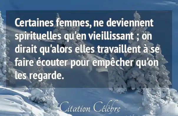 Certaines femmes, ne deviennent spirituelles qu'en vieillissant ; on dirait qu'alors elles travaillent à se faire écouter pour empêcher qu'on les regarde.
