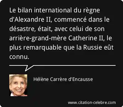 Le bilan international du règne d'Alexandre II, commencé dans le désastre, était, avec celui de son arrière-grand-mère Catherine II, le plus remarquable que la Russie eût connu.