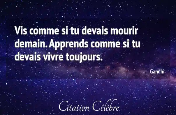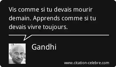 Cette célèbre phrase de Gandhi est une exhortation à adopter deux attitudes fondamentales et apparemment contradictoires : l'urgence de l'action et la patience de l'apprentissage. Elle vous invite à vivre pleinement chaque instant, sans regret ni procrastination, tout en cultivant une soif de savoir et de développement personnel illimitée.