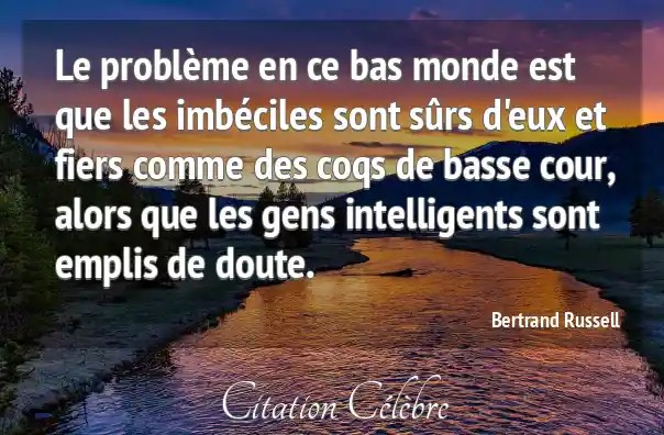 Le problème en ce bas monde est que les imbéciles sont sûrs d'eux et fiers comme des coqs de basse cour, alors que les gens intelligents sont emplis de doute.