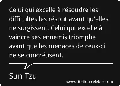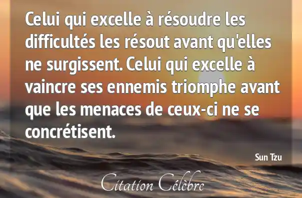 Celui qui excelle à résoudre les difficultés les résout avant qu'elles ne surgissent. Celui qui excelle à vaincre ses ennemis triomphe avant que les menaces de ceux-ci ne se concrétisent.